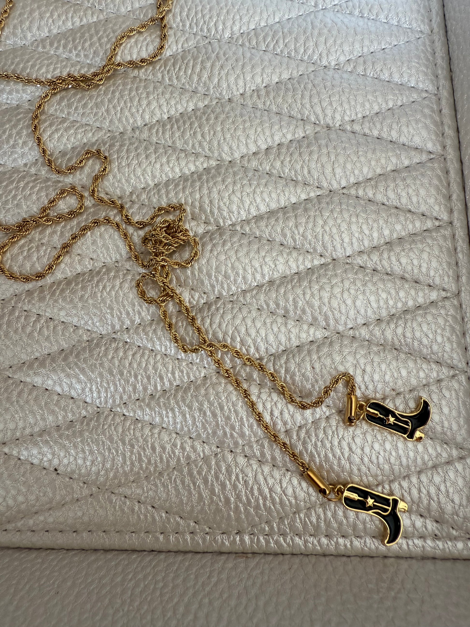 Say hello to The Cowgirl Charm Necklace, where western spirit meets golden glam. This 18K gold-plated stainless steel lariat features two black enamel boot charms with a touch of sparkle that makes it simply irresistible. Tarnish-free, lightweight, and effortlessly chic, it’s your new go-to for adding that yee-haw meets luxe energy to any outfit. 💫