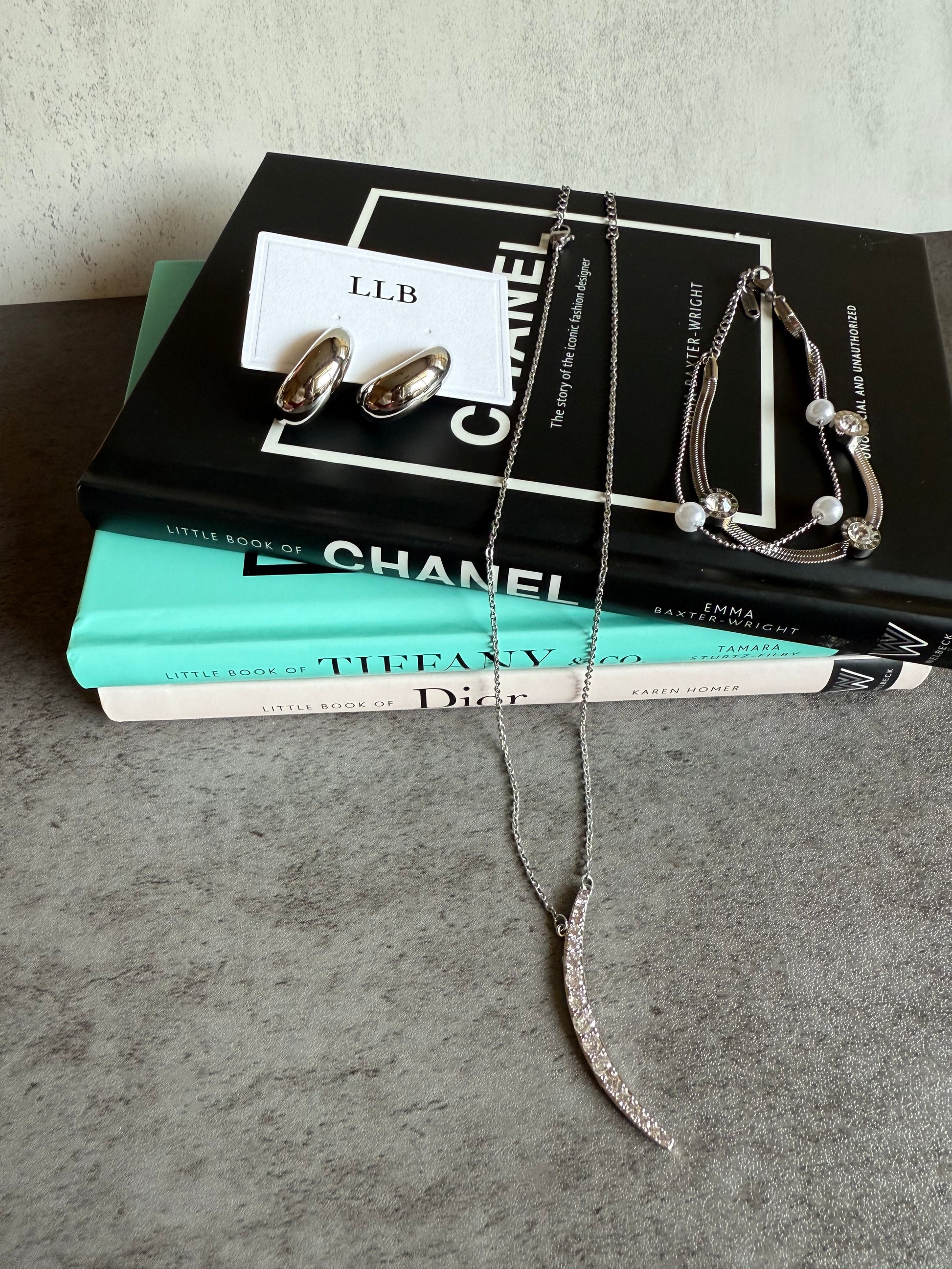✨ Necklace: Crescent-style pendant lined with crystals for a touch of sparkle.